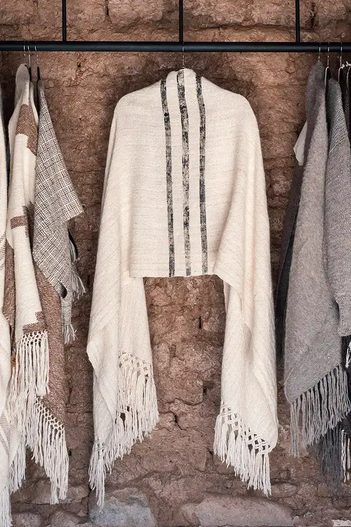 Ruana de lana de llama, teñida con tintes naturales. Hilada a mano. Tejida en telar.