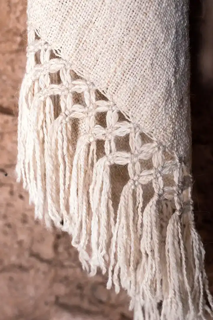 Ruana blanca con flecos de macramé