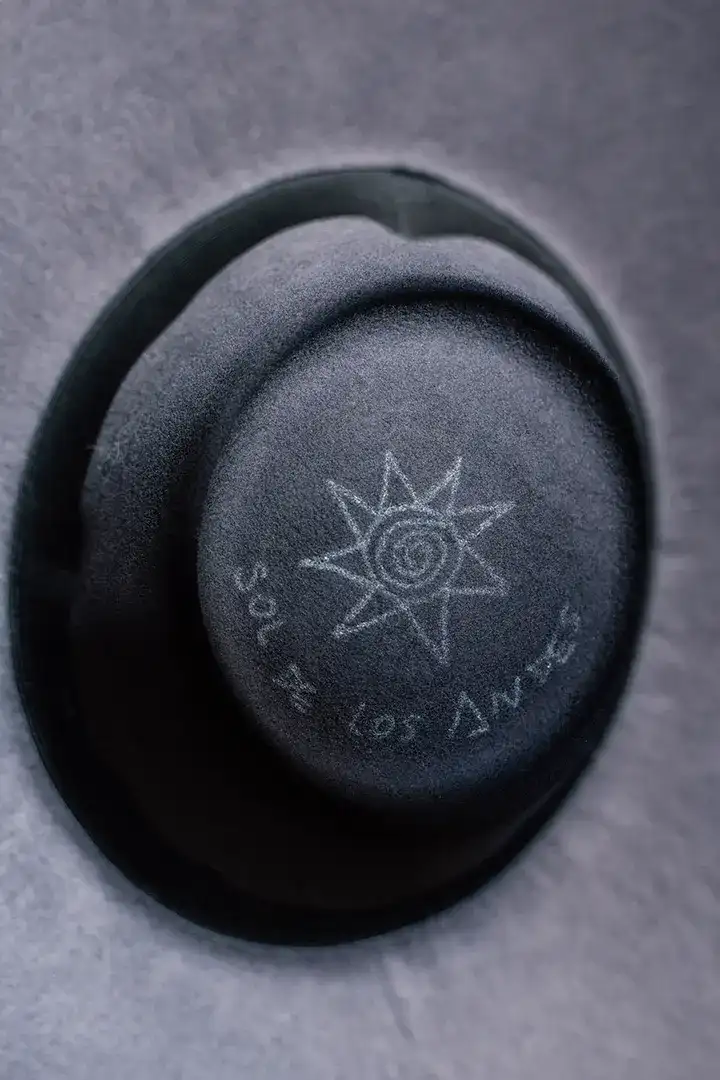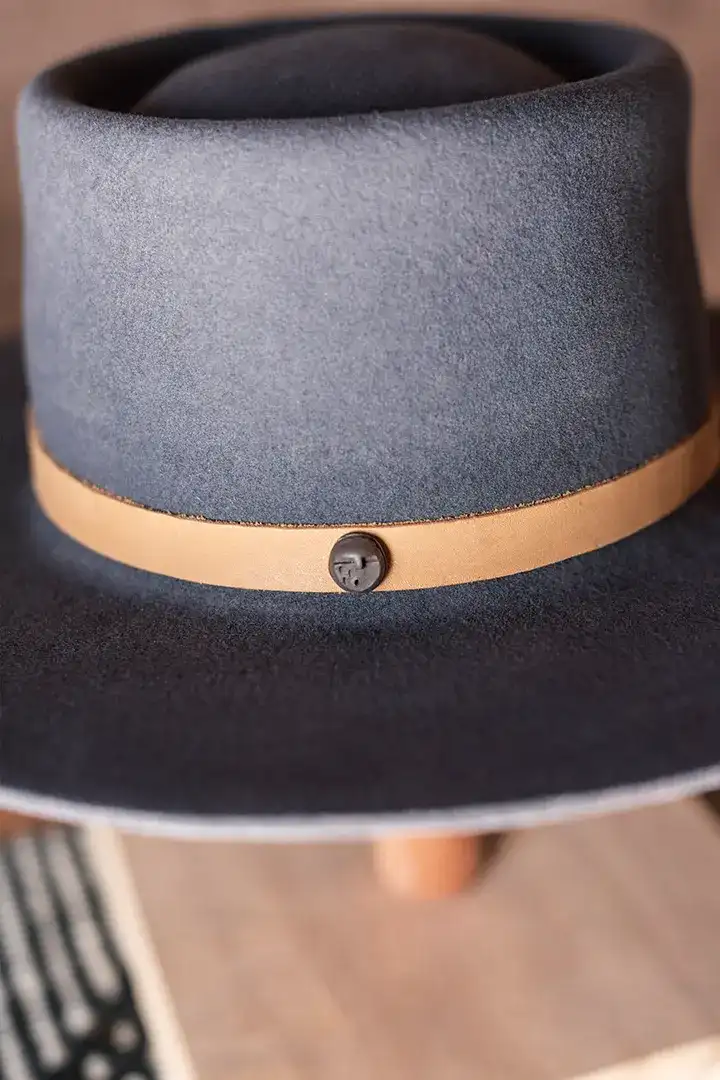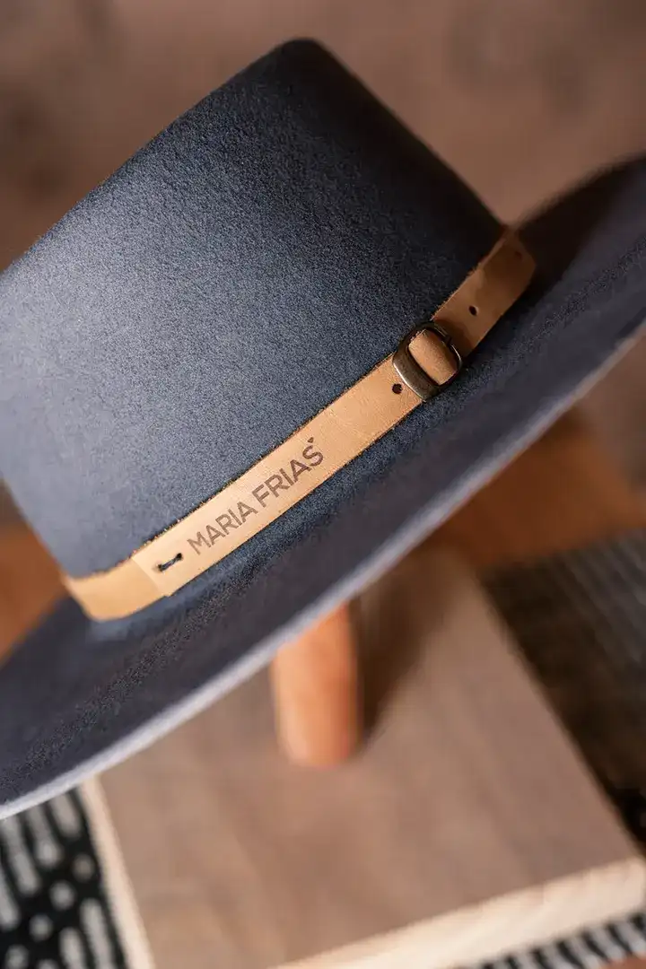 Sombrero de fieltro de lana de oveja. Copa alta. Cinta de cuero con hebilla y pin. Badana interna textil.