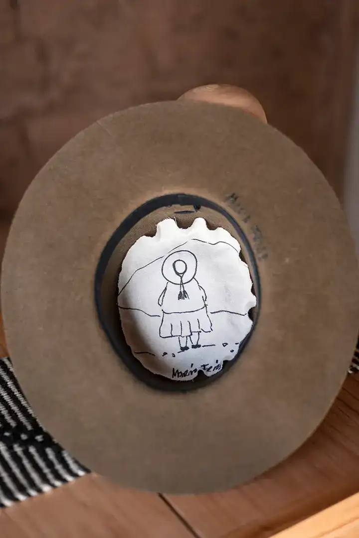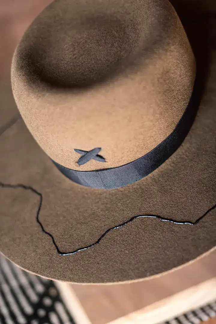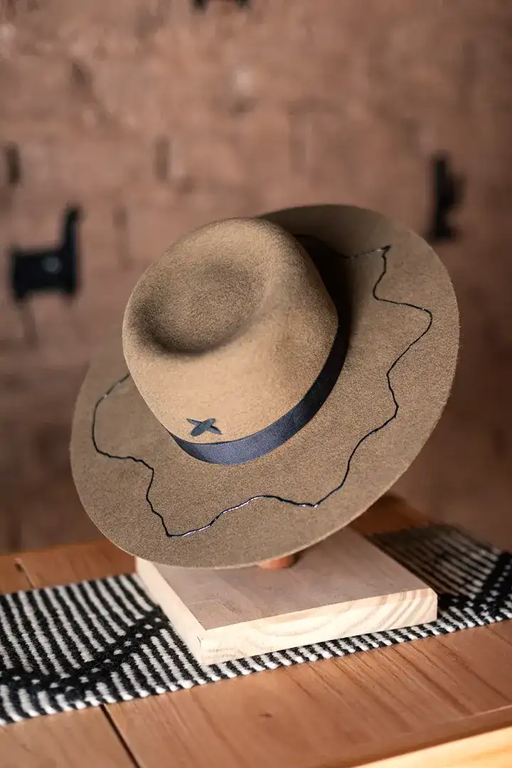 Sombrero de fieltro de lana de oveja con decorados en relieve. Cinta y badana interna textil.