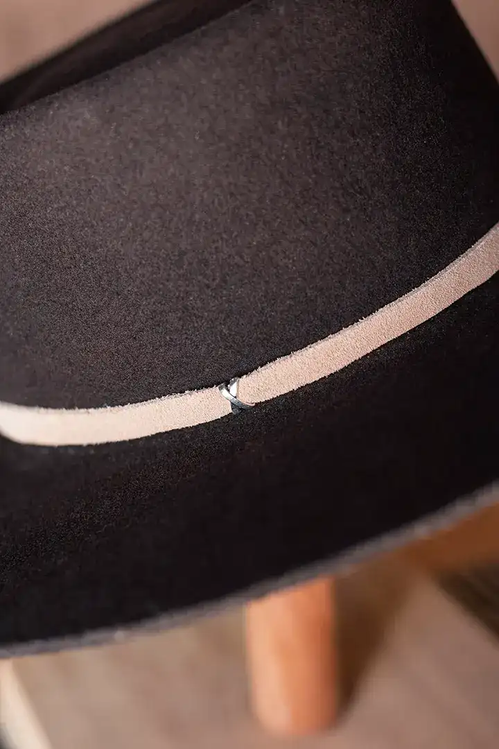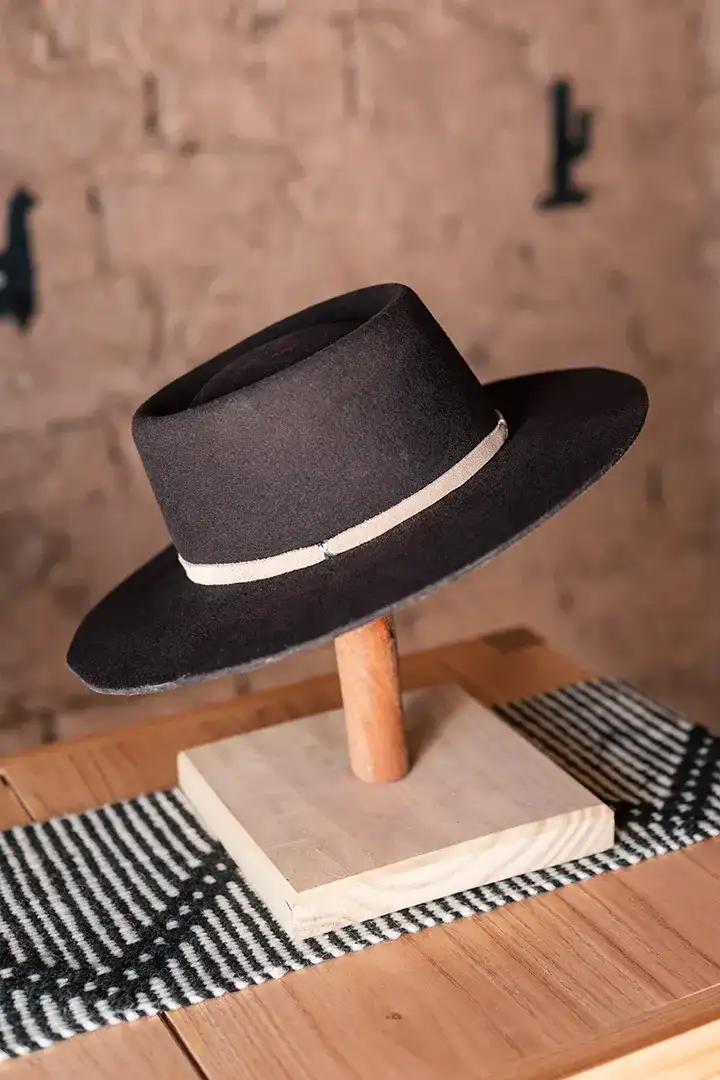 Sombrero de fieltro de lana de oveja. Cinta de cuero y pin. Badana interna textil.
