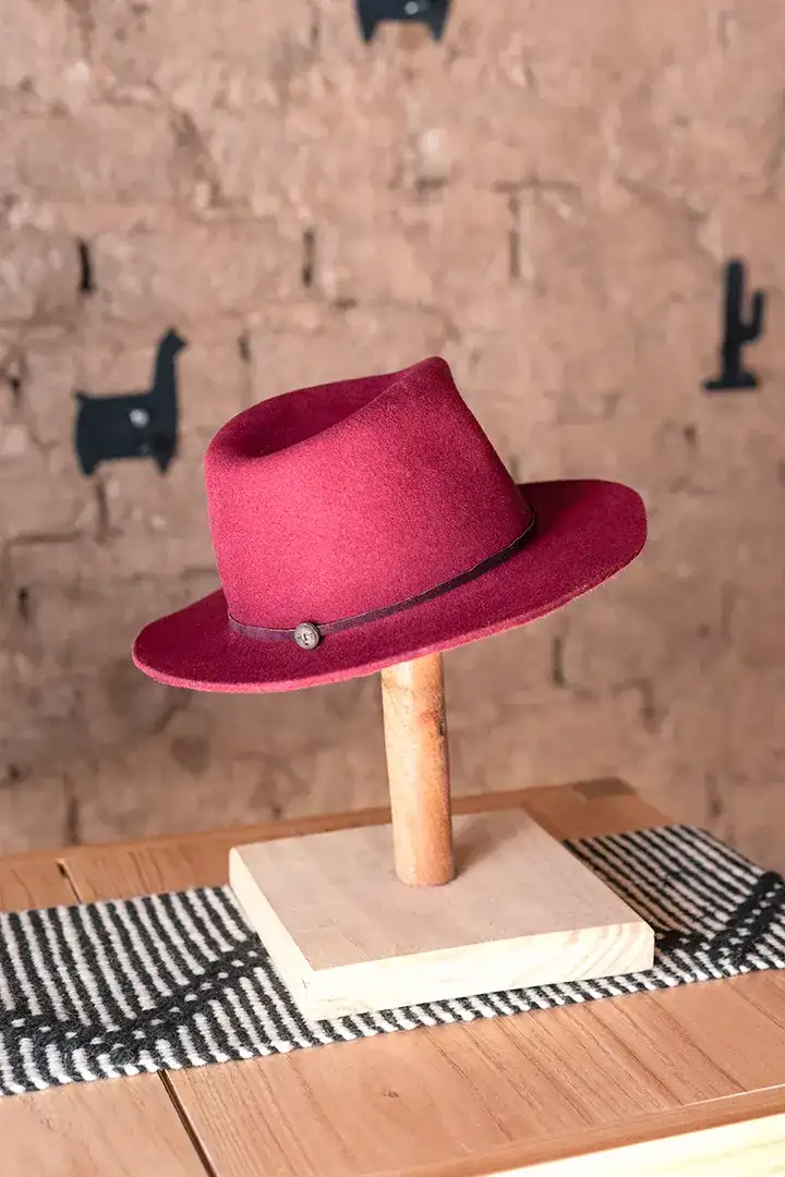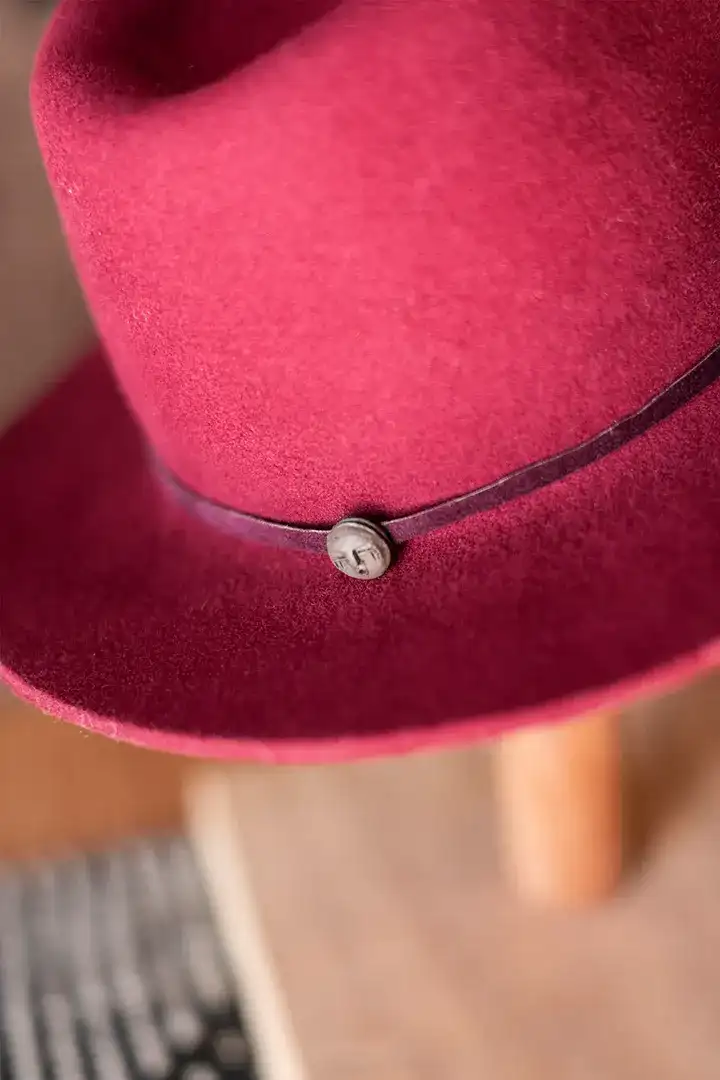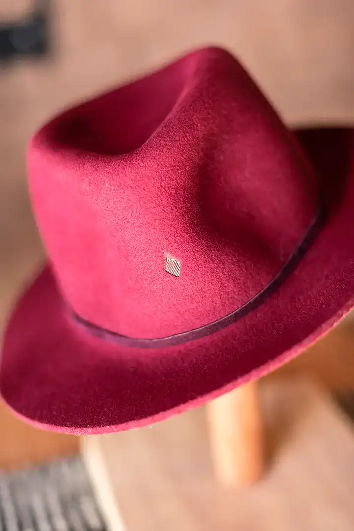 Sombrero de fieltro de lana de oveja. Cinta de fieltro y pin. Badana interna textil.